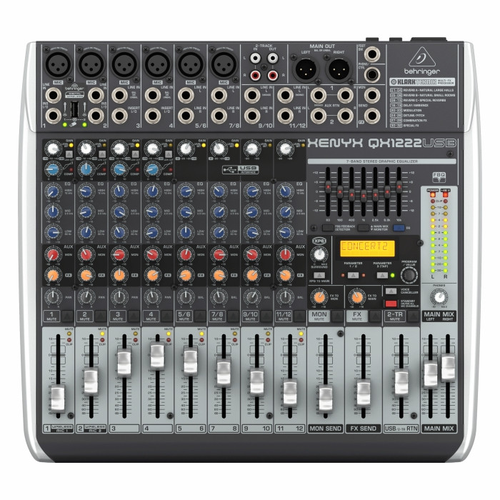 The compact XENYX QX1222USB mixer allows you to effortlessly achieve premium-quality sound. Channels 1 - 4 feature our XENYX Mic Preamps, renowned for their pristine performance, plus 2 of the 4 stereo channels accept XLR inputs, as well as Line-Level sources. All mono channels get our ultra-musical “British” 3-band EQs and easy-to-use “one-knob” compressors for the ultimate in punch and clarity. Add to this our KLARK TEKNIK FX processor with 32 studio-grade presets with dual addressable parameters, Tap function and storable user parameter settings – and the QX1222USB becomes an incredibly versatile mixer for your live performances.